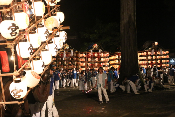 神社の境内に提灯が灯った神輿が数台置いてあり法被姿の男性らが集まっている手前で提灯が灯った山車が上げられている写真 拡大画像 (JPEG: 178.2KB)