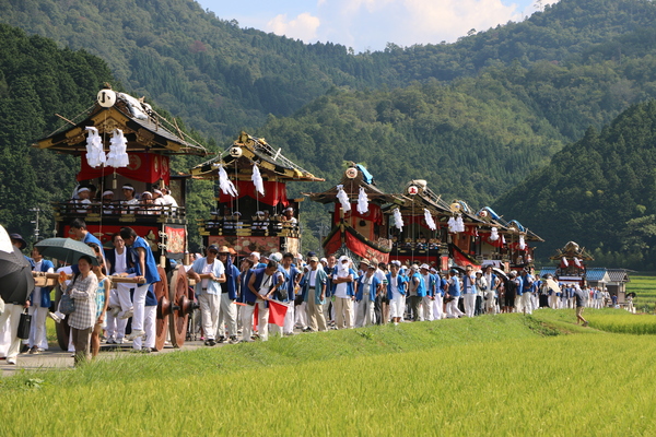 子供らが乗っている山車が数台連なり法被姿の男性らが押して練り歩いている写真 拡大画像 (JPEG: 221.6KB)