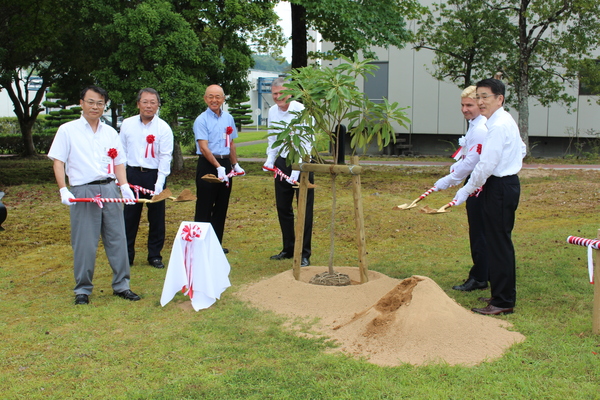 市長やダーク・コッシャ社長さんや関係者の方々が紅白のリボンが巻いてあるスコップを持って、植樹をしている様子の写真 拡大画像 (JPEG: 224.8KB)