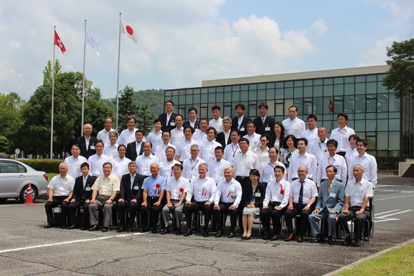 ガラス張りの建物の前で、式典の出席者が集まって並んで写っている記念写真 拡大画像 (JPEG: 178.1KB)