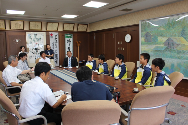 市長室にて、西紀スイミングスクールの生徒5名が黄色と青色の入ったジャンパーを着て座っており、前方に座った教育長の話を聞いている様子の写真 (JPEG: 165.1KB)