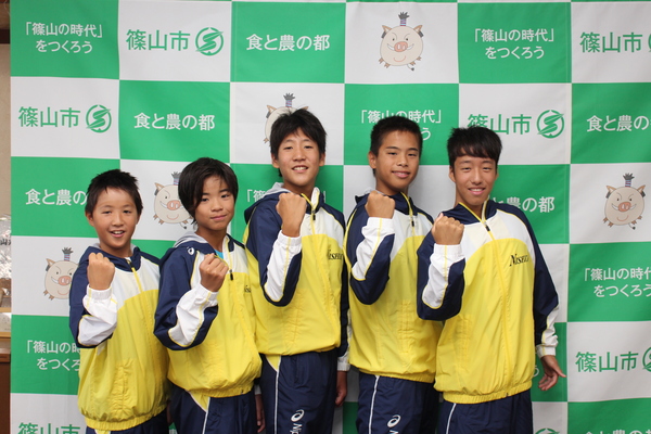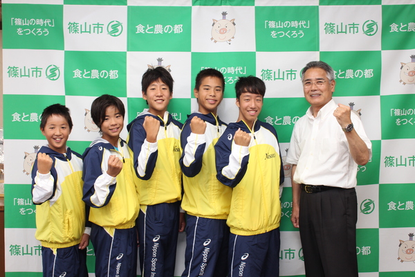 西紀スイミングスクールの生徒5名が黄色と青色の入ったジャンパーを着て、教育長とガッツポーズをして写っている写真 拡大画像 (JPEG: 166.1KB)