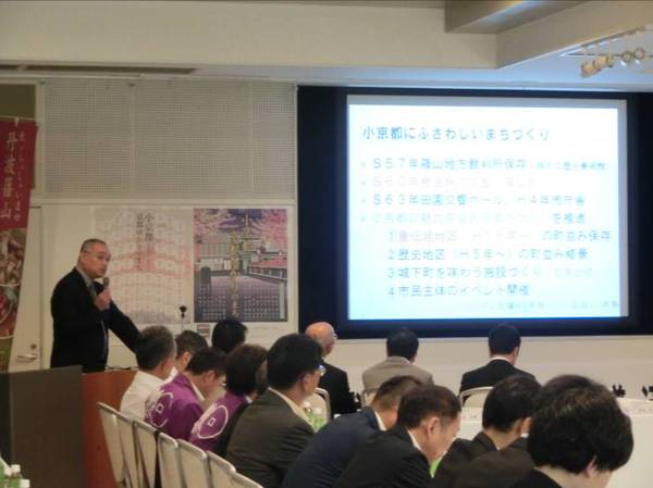 この日は、篠山市地域計画課の横山景観室長が「小京都としての魅力を高める~篠山市の景観まちづくり」と題し、先人から引き継ぎ大切に守っている町並みの取り組みなどを紹介しました。
