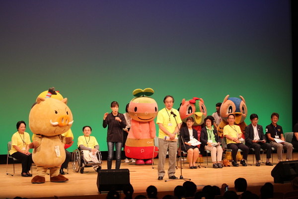 ステージの上で黄色いTシャツを着た男性がマイクで話していて、その横で手話で説明する女性や着ぐるみが立っている写真 拡大画像 (JPEG: 141.5KB)