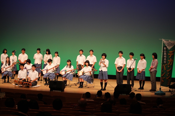 ステージの上で学生が20名ほど並んでいて、5名が三味線、2名が太鼓、その他の人たちが笛を持っている写真 拡大画像 (JPEG: 132.5KB)