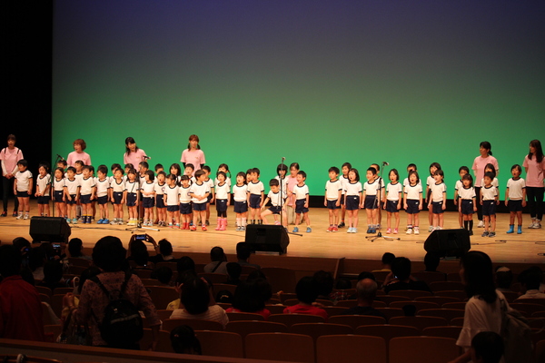 ステージの上で30名ほどの白い体育着を来た幼稚園生や、ピンクのポロシャツを来た先生が並んでいる写真 拡大画像 (JPEG: 136.3KB)