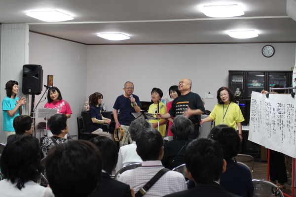 8名の男女がピアノやタンバリンなどに合わせて歌っている写真 拡大画像 (JPEG: 130.9KB)