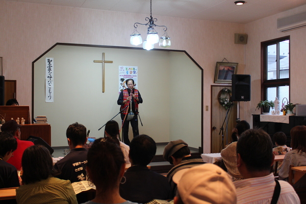 十字架の飾ってあるステージの上で男性が大きな笛を吹いていて、10名ほどの人が聞いている写真 拡大画像 (JPEG: 132.2KB)