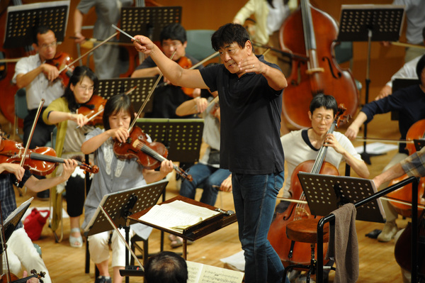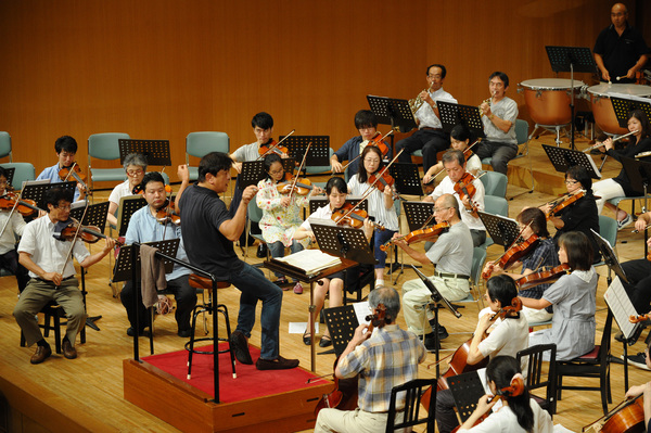 舞台で黒い服装をした管弦楽団が指揮者に合わせて演奏している写真 拡大画像 (JPEG: 146.3KB)