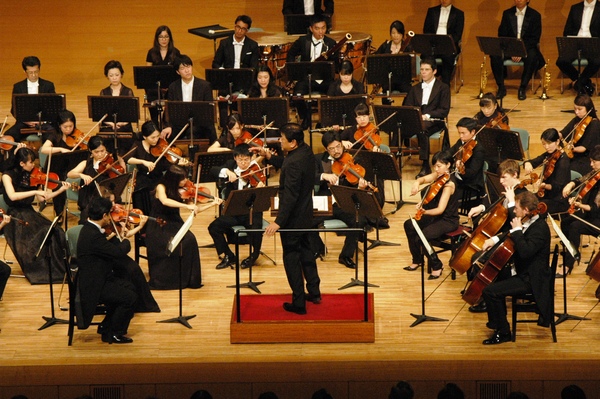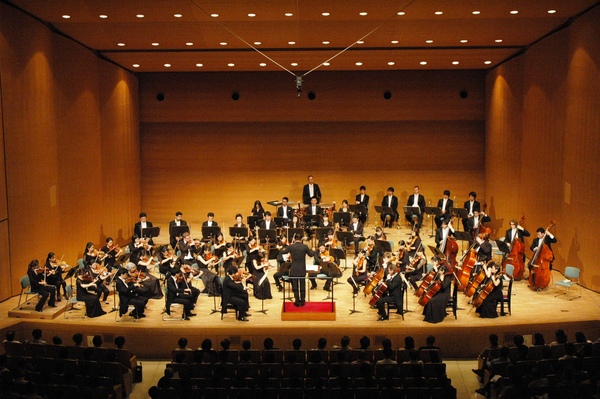 舞台で黒い服装をした管弦楽団が指揮者に合わせて演奏しているのを観客席で鑑賞している人々の写真 拡大画像 (JPEG: 122.2KB)