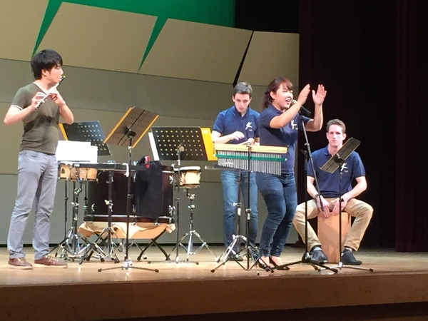 打楽器とフルートの演奏をバックにスタンドマイクで女性が歌っている写真 拡大画像 (JPEG: 105.7KB)