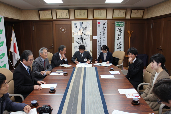 篠山市民ランナーの雪岡 誠太さんと足立 幸子さんを交えて会議室で打ち合わせが行われている様子を書記している職員の写真 拡大画像 (JPEG: 156.3KB)