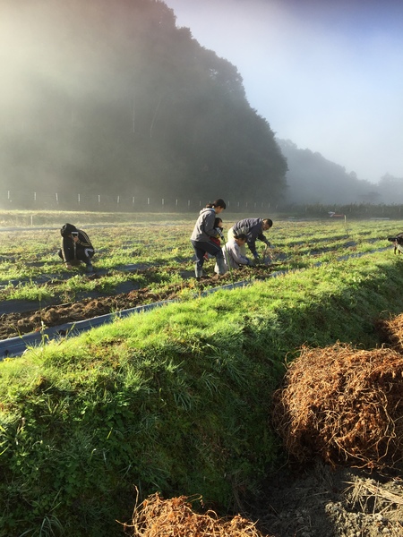 霧がかかっている畑でシャベルをもった家族が畑の手入れをしている写真 拡大画像 (JPEG: 139.7KB)