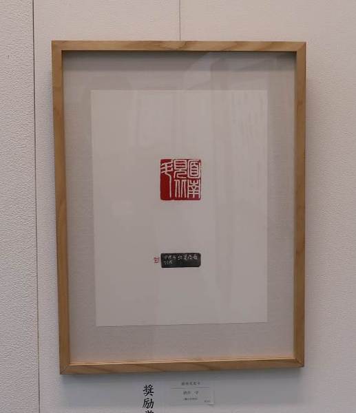 透明のガラスケースに入れられている、赤い朱肉で印が押されており、 篆書体(てんしょたい)で書かれた文字が写っている「面南見北斗」の作品の写真 拡大画像 (JPEG: 21.3KB)