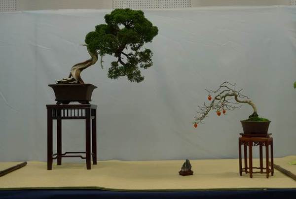 足の高い台の上に幹が曲がりくねった松の盆栽が置かれており、右かわには、白い幹に赤い実のなっている盆栽が置かれている「山懐(真柏・ロウヤ柿)」という作品名の写真 拡大画像 (JPEG: 19.6KB)