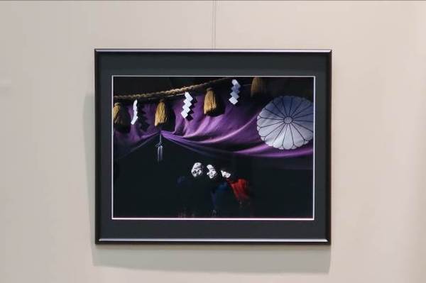 紫色の幕に菊花紋章が入っており、その前にしめ縄があり、紫の幕の下から、白いおかめのお面を被った3人の人が顔のぞかせている写真で「節分の日」という題名の作品の写真 拡大画像 (JPEG: 15.0KB)