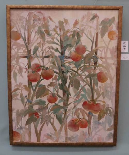 沢山のトマトが実っている様子を淡くやさしいタッチで描いている日本画の作品の写真 拡大画像 (JPEG: 39.3KB)