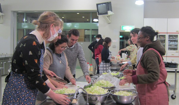 外国の方達がキャベツを切って料理を習っている写真 拡大画像 (JPEG: 64.7KB)