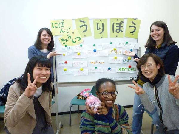 にほんごきょうしつうりぼうと書かれたホワイトボードの前で5人の外国の女性の方が笑顔でピースをしている写真 拡大画像 (JPEG: 38.4KB)