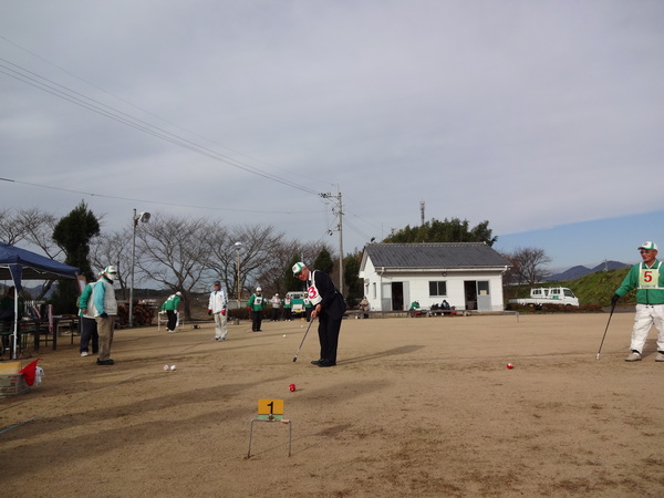 白地に赤文字のゼッケンを首にかけた男性が1番の的に向かって赤いボールを打っている写真 拡大画像 (JPEG: 79.1KB)
