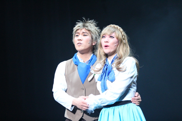 赤の衣装の女性と茶色に金髪の男性が歌っていて、後ろに白い衣装を着た方が並んで歌っている写真 拡大画像 (JPEG: 142.9KB)