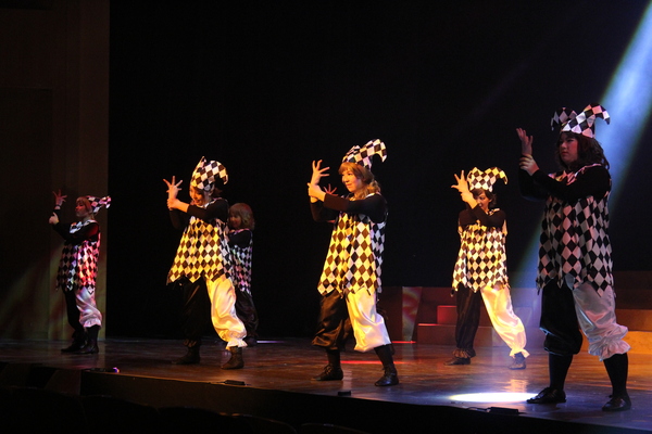 ピノッキオの衣装で左足をそろってあげてダンスをしている多くの出演者の写真 拡大画像 (JPEG: 121.6KB)
