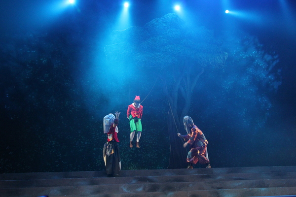 木に吊り下げられたピノキオと両脇に悪さをしている2人がいる写真 拡大画像 (JPEG: 120.1KB)