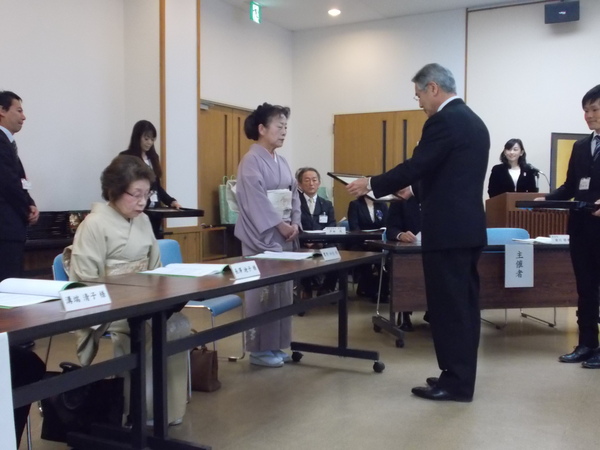 紫の着物の女性がスーツを着た男性から表彰をされている写真 拡大画像 (JPEG: 92.7KB)