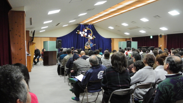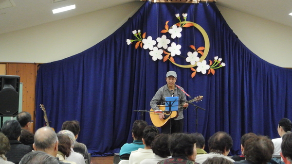 「古市地区文化活動発表会」トリを務めた進戸納さんのギター弾き語り正面の様子と観覧者の写真 拡大画像 (JPEG: 160.8KB)
