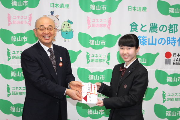 笑顔の女子生徒が、市長から金一封を受け取っている写真 拡大画像 (JPEG: 151.8KB)