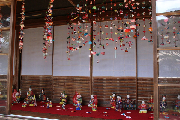 住吉神社の建物に飾られたつるし飾りと、飾られた人形の写真 拡大画像 (JPEG: 172.8KB)