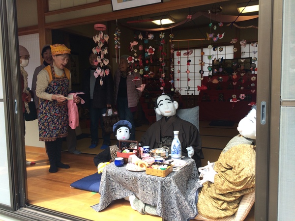 民家の縁側で、机の上に並べられたご馳走を囲んで座る、かかしの家族の写真 拡大画像 (JPEG: 131.8KB)