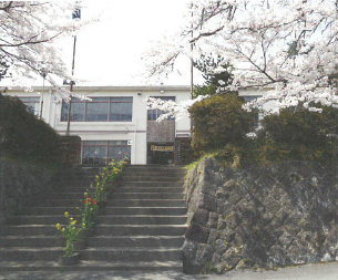 旧校舎手前の階段の中央に咲いている菜の花と、桜の開花が写っている写真 拡大画像 (PNG: 144.0KB)