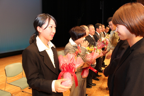 花束を持ち横一列に並ぶ退職者の前に並ぶ、男女の写真 拡大画像 (JPEG: 146.7KB)