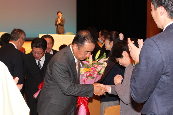 花束を持ち退場する退職者が、職員と順番に挨拶をしたり握手をしている写真 拡大画像 (JPEG: 132.1KB)