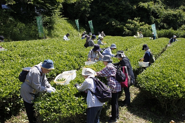 帽子を被っている女性の方々が茶の葉を摘み、透明の籠に入れている写真 拡大画像 (JPEG: 215.5KB)