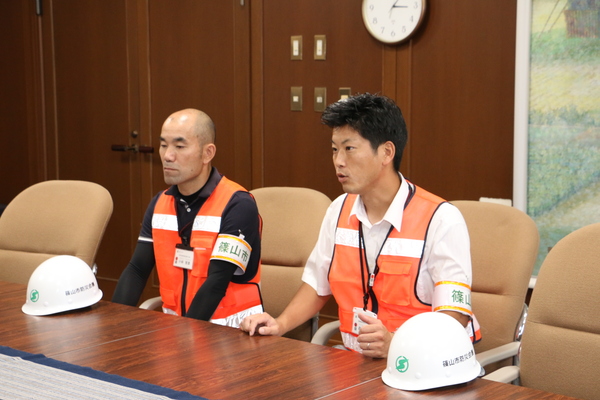 机の上にヘルメットが置いてあり、オレンジ色の安全ベストを着ている市民安全課の小林 智彦主査と農都政策課の森本 良太係長の写真 拡大画像 (JPEG: 130.7KB)