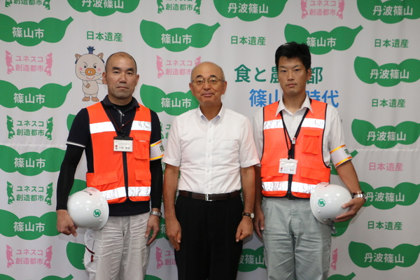 市長を間に挟んで、市民安全課の小林 智彦主査と農都政策課の森本 良太係長の3人が写っている写真 拡大画像 (JPEG: 158.4KB)