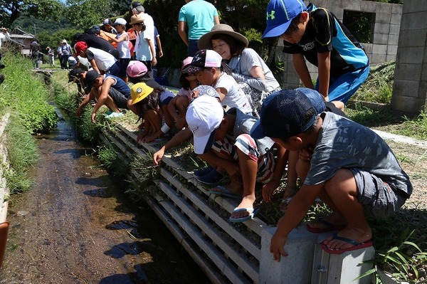 水路をのぞき込むたくさんの子供たちの写真 拡大画像 (JPEG: 115.6KB)