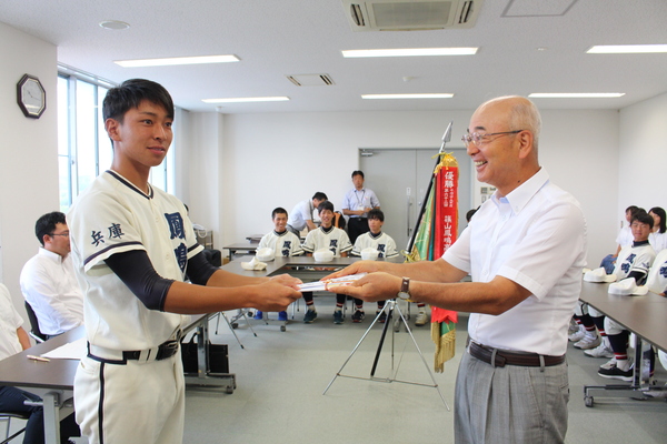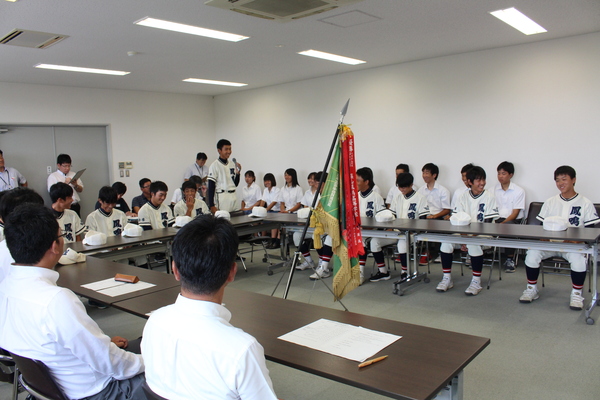 主将の大木君から「全国大会では、一戦一戦全員で戦っていきたい」、稲谷監督からは「様々な方から応援をいただいたので、感謝の気持ちをもって一つひとつ勝ち抜いていきたい」、との言葉がありました。