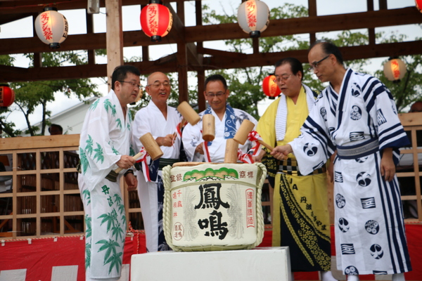 浴衣姿の市長と、男性4名にて鏡開きをしている写真 拡大画像 (JPEG: 186.6KB)