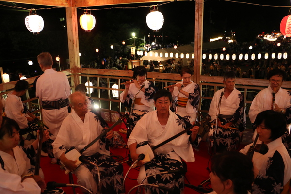 やぐら内で、楽器を演奏する男女の写真 拡大画像 (JPEG: 178.3KB)