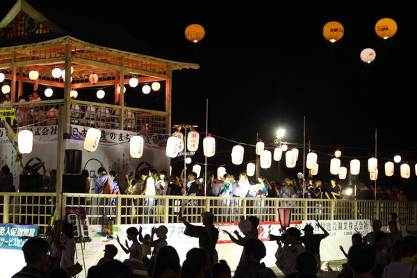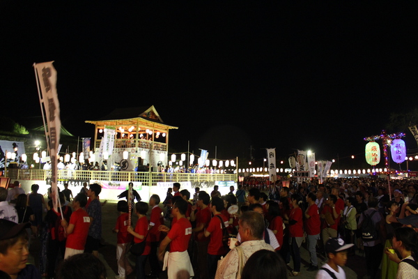 ライトアップされたやぐらの周りを踊る、沢山の人々の写真 拡大画像 (JPEG: 161.0KB)