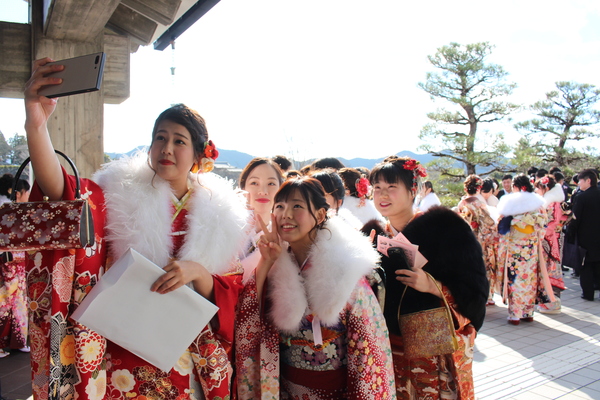 振袖を着た新成人達が自撮り写真を撮る為にスマートフォンに向かってピースサインや笑顔を向けている写真 拡大画像 (JPEG: 173.9KB)
