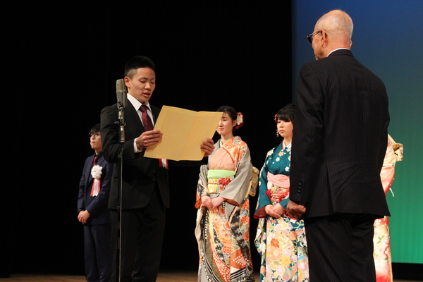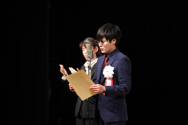 副実行委員長の井谷君が舞台上で、メガネを掛けた黒いスーツの男性の前に立ち、黄色い表紙を両手で持ち、書かれている文章を読み上げている様子の写真 拡大画像 (JPEG: 107.5KB)