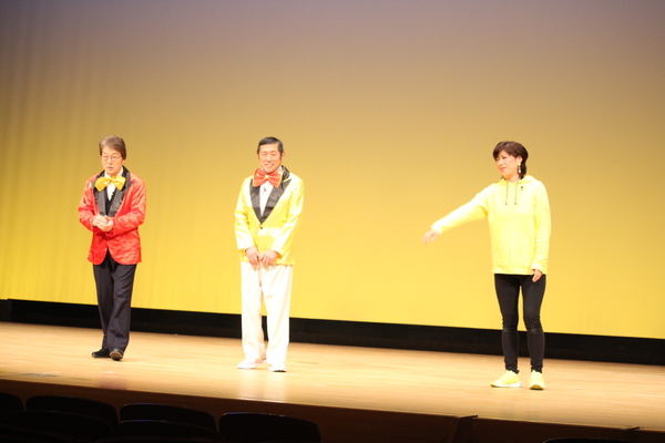 赤いジャケットに金色の蝶ネクタイの男性と、金色のジャケットに赤い蝶ネクタイの男性が立っており、黄色いパーカーを着た女性が右手を前に出している寸劇の場面の写真 拡大画像 (JPEG: 94.0KB)