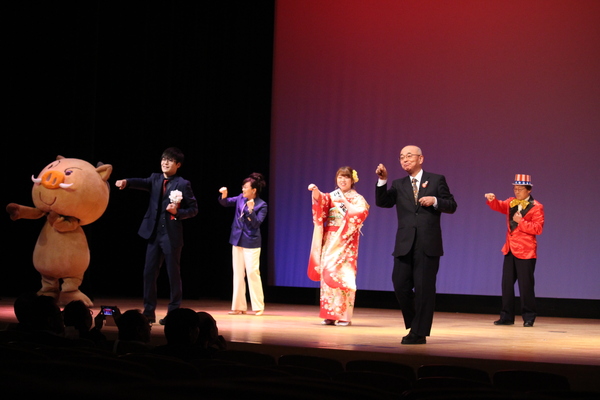 市長のあいさつでは、「市長劇団」(中村秘書と乾劇団の有志の皆さんたち)が登場、西城秀樹のYMCAのダンスなどで丹波篠山市を担っていただくようお願いしました。