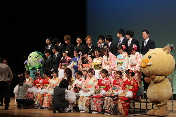 舞台上に出席した新成人が上がっており、前列に振袖を着た新成人が座っており、後方に、スーツを着た新成人が立っており左端に「まめりん」も一緒に写っている集合写真 拡大画像 (JPEG: 213.0KB)