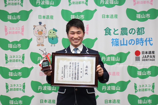 篠山鳳鳴高校軟式野球部3年の市野 咲(いちの しょう)君が、このたび兵庫県高校野球連盟の平成30年度優秀野球選手表彰を受賞され、報告に来ていただきました。