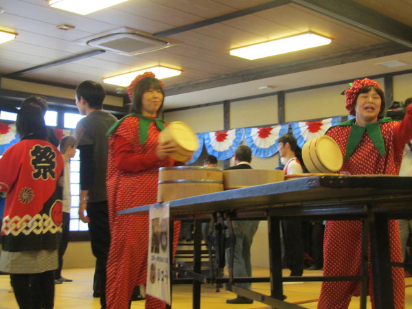 イチゴのコスチュームを着た2人の女性が桶で卓球をしている写真 拡大画像 (JPEG: 82.4KB)